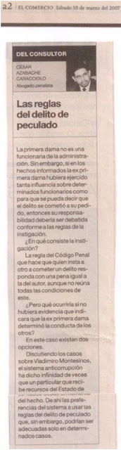 En prensaDeclaraciones sobre las reglas del delito de peculado en Peru 21 César Azabache / 10/03/2007