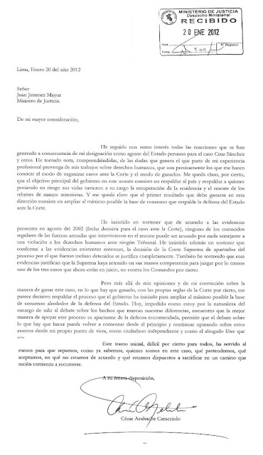 Lima, Enero 20 del año 2012 Señor Juan Jimenez Mayor Ministro de Justicia. De mi mayor consideración, He seguido con